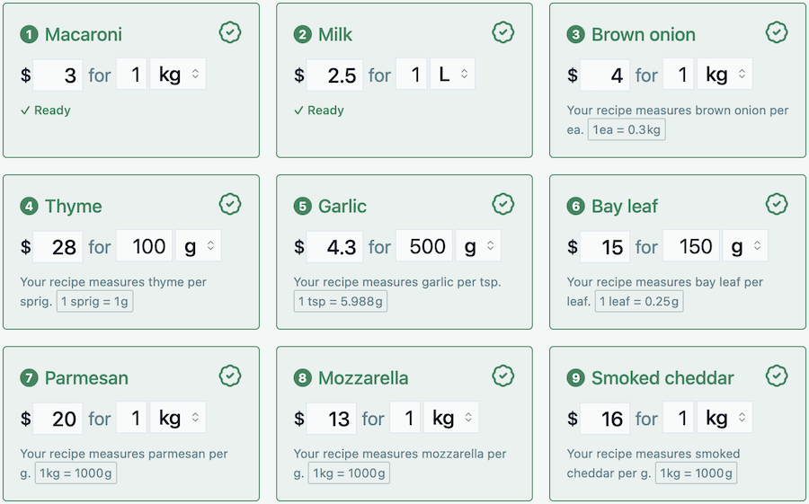 Smart unit pricing. Even if you buy by box and use by tsp, calculating ingredient costs is smooth as butter.